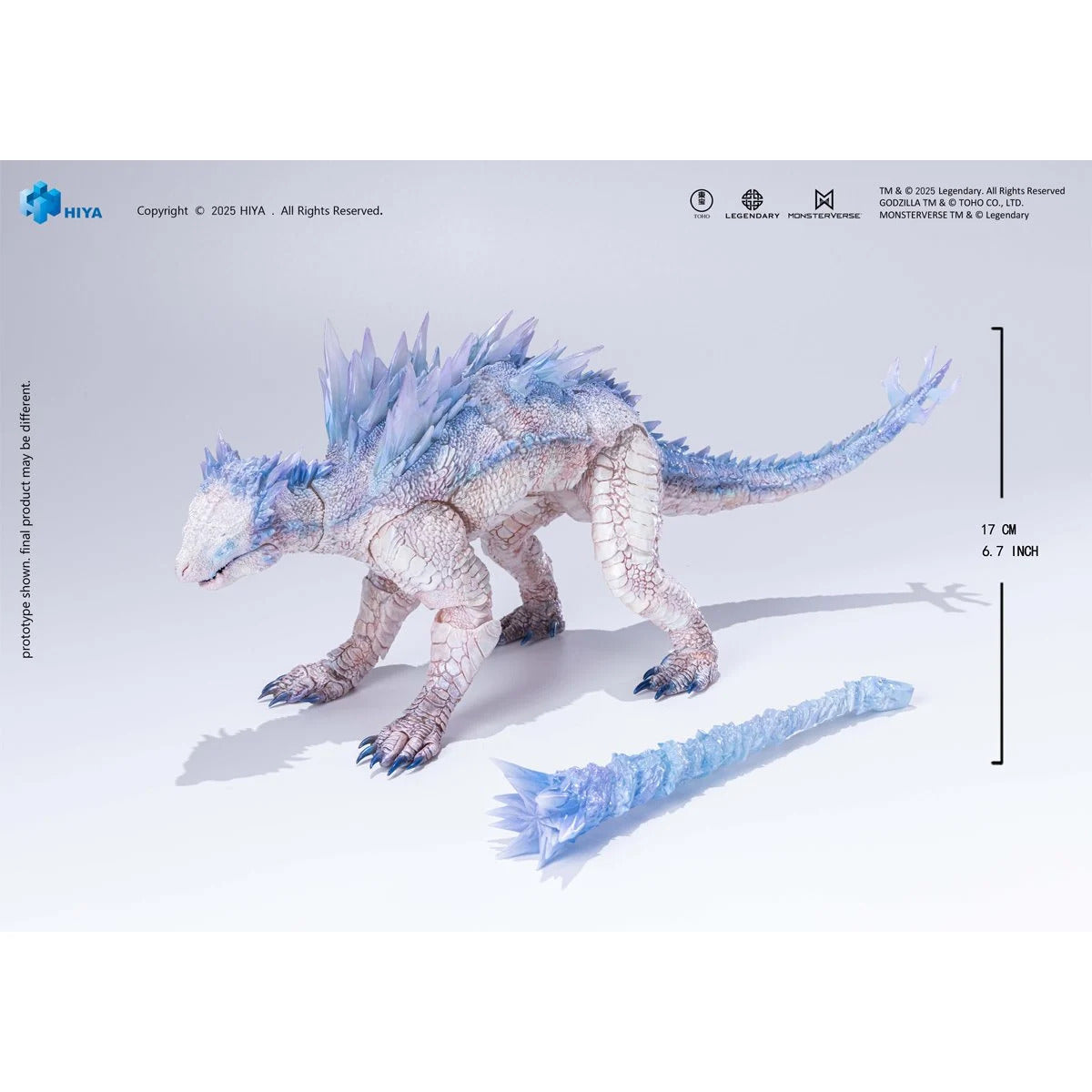 Beyond Frost! Hiya Toys presents the Godzilla x Kong: The New Empire Shimo Frost Bite Blast Exquisite Basic Series None Scale 7-Inch Action Figure! This Exquisite Basic Series Shimo Frost Bite Blast stands approximately 6 3/4-inches tall and is crafted with attention to detail and faithfully reproduces every aspect of Shimo's appearance from the Godzilla x Kong: The New Empire. This figure features multiple joints throughout the body, ensuring an authentic appearance while providing a wide range of articulation. When illuminated, the finely textured body features multi-layer paint applications that reflect a glacial glow, while the translucent dorsal fins shimmer with icy brilliance, showcasing the majestic presence of this ancient Titan. This figure includes 1x Frost Bite Blast effect part, allowing you to recreate this iconic Frost Bite Blast scene with Shimo in full display.